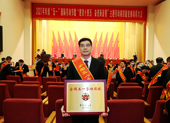 公司榮獲全國(guó)五一勞動(dòng)獎(jiǎng)狀,集團(tuán)董事長(zhǎng)苗樹(shù)文登臺(tái)領(lǐng)獎(jiǎng)。