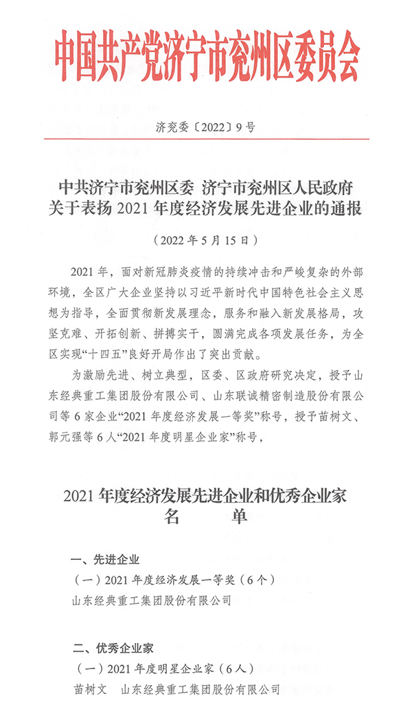 5月15日,兗州區(qū)委區(qū)政府發(fā)布《關(guān)于表?yè)P(yáng)2021年度經(jīng)濟(jì)發(fā)展先進(jìn)企業(yè)的通報(bào)》,授予山東經(jīng)典重工集團(tuán)股份有限公司“2021年度經(jīng)濟(jì)發(fā)展一等獎(jiǎng)”稱(chēng)號(hào),授予經(jīng)典集團(tuán)董事長(zhǎng)苗樹(shù)文“2021年度明星企業(yè)家”稱(chēng)號(hào)。