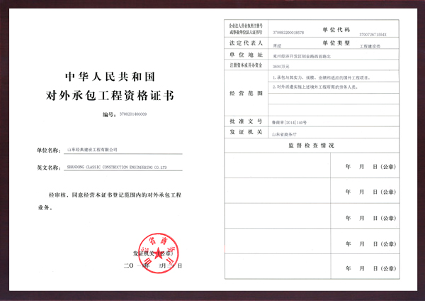 山東經(jīng)典建設工程有限公司對外承包工程業(yè)務經(jīng)營范圍包括:承包與自身實力、規(guī)模、業(yè)績相適應的國外工程項目,對外派遣實施上述境外工程所需的勞務人員。