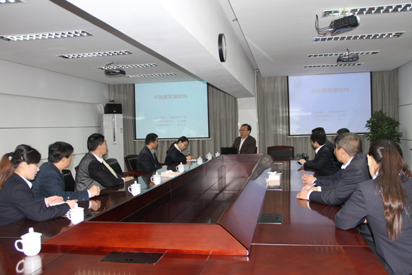 寶鋼集團(tuán)賀總在會(huì)議室講解中國(guó)鋼結(jié)構(gòu)行業(yè)相關(guān)專業(yè)知識(shí)