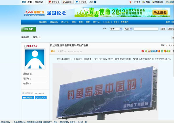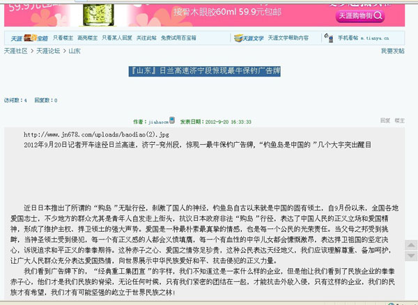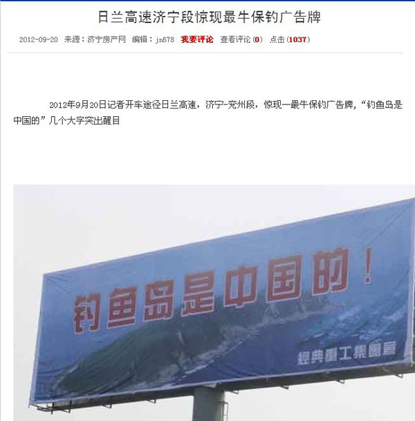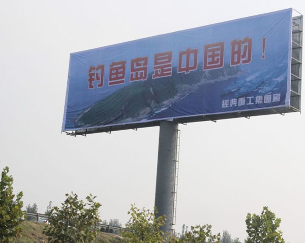 近一段時期以來日本推出了所謂的“購島”無恥行徑,刺激了國人的神經(jīng),我們集團作為中華民族大家庭的一員,有責任也有義務(wù)保衛(wèi)我們祖國領(lǐng)土的完整,和不容侵犯,為此集團領(lǐng)導(dǎo)代表集團全體員工通過各種方式彰示了我們的愛國熱情,并付諸于實際行動斥巨資在日蘭高速濟寧段制作了高炮廣告“釣魚島是中國的”以顯示我們保釣之決心。