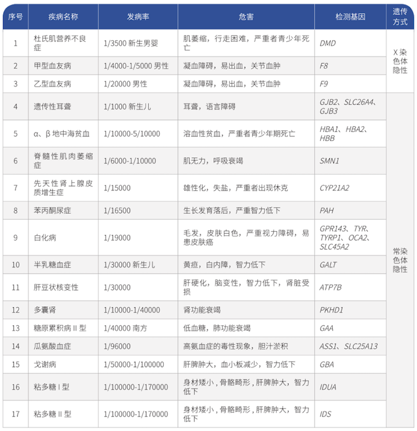 ? ? 17種單基因遺傳病基因檢測(cè)利用BES 4000基因測(cè)序儀,對(duì)17種遺傳病相關(guān)的27個(gè)基因進(jìn)行高通量測(cè)序,然后利用個(gè)人基因組數(shù)據(jù)分析管理軟件,檢測(cè)致病突變。結(jié)合遺傳咨詢和產(chǎn)前診斷,減少出生缺陷。