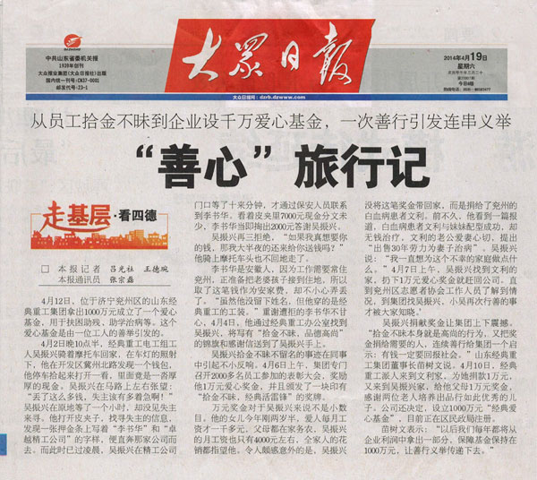 4月12日,位于濟(jì)寧兗州區(qū)的山東經(jīng)典重工集團(tuán)拿出1000萬成立了一個(gè)愛心基金,用于扶困助殘、助學(xué)治病等。這個(gè)愛心基金是由一位工人的善行義舉引發(fā)的。