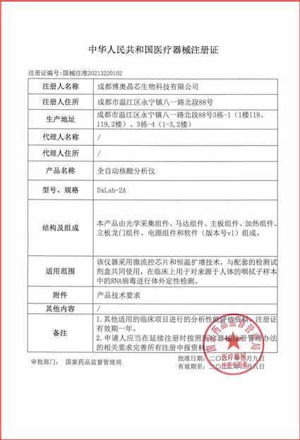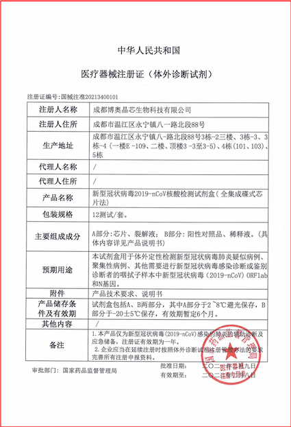 2021年2月10日,恰逢新春佳節(jié)來臨之際,依托國家科技部應(yīng)急攻關(guān)項(xiàng)目,博奧聯(lián)合清華大學(xué)成功研發(fā)的由新型冠狀病毒2019-nCoV核酸檢測(cè)試劑盒(全集成碟式芯片法)(國械注準(zhǔn):20213400101)和全自動(dòng)核酸分析儀(國械注準(zhǔn):20213220102)組成的全集成芯片實(shí)驗(yàn)室獲國家藥監(jiān)局應(yīng)急審批批準(zhǔn),為全國新冠肺炎疫情防控提供現(xiàn)場(chǎng)快速檢測(cè)“芯”利器。