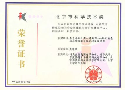 另外,與本產(chǎn)品相關的“基于孕婦外周血游離DNA的胎兒染色體異常檢測系統(tǒng)的研發(fā)及應用”榮獲2018年度北京市科學技術獎二等獎。
