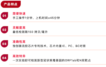 基于全新一代先進(jìn)的芯片實(shí)驗(yàn)室(Lab-on-a-chip)設(shè)計(jì)理念,化繁為簡,檢測時(shí)僅需將樣本保存液加入芯片,封閉芯片后即可上機(jī),手工操作小于1分鐘。生物反應(yīng)全程(包括核酸提取、核酸純化、擴(kuò)增反應(yīng)、核酸檢測和結(jié)果判讀等)均集成在一個(gè)整體密閉、內(nèi)部分區(qū)的微流控芯片內(nèi),由全自動核酸分析儀完成,因此無需專業(yè)分區(qū)實(shí)驗(yàn)室,無需人工干預(yù),最大程度降低操作人員感染及樣本間交叉污染的風(fēng)險(xiǎn)。45分鐘完成實(shí)驗(yàn)全過程,最快可在35分鐘內(nèi)檢出新冠陽性樣本,檢測靈敏度可達(dá)150拷貝/毫升,在截至目前國內(nèi)獲批的同類產(chǎn)品中靈敏度最高,真正實(shí)現(xiàn)“樣本進(jìn)-結(jié)果出”。