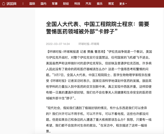 “伊拉克戰(zhàn)爭就是一個教訓,美國與伊拉克開戰(zhàn)時,對整個伊拉克實行全面禁運,任何國家的飛機都飛不進去,美國雖然聲稱這樣做針對的是伊拉克軍隊,但卻殃及普通伊拉克百姓,許多病人因此沒有了救命的藥和醫(yī)療器械該怎么辦?這是一個值得思考和警惕的問題?!?月7日,全國人大代表,中國工程院院士、醫(yī)學生物物理學家程京在接受《環(huán)球時報》記者采訪時表示,國家應該科學地謀劃中醫(yī)藥的發(fā)展,鼓勵其他學科的力量加入到中醫(yī)藥的交叉創(chuàng)新中來,真正實現(xiàn)中西醫(yī)并重,這樣即便有朝一日真的遭遇外部封鎖,我們也不會在事關人民健康和生命安全的醫(yī)藥領域被外部卡住“脖子”。