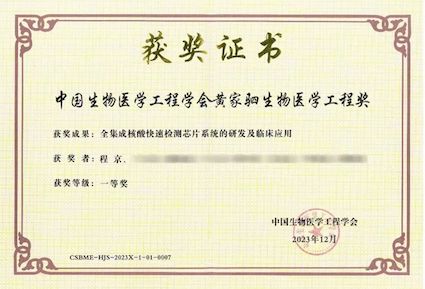 在程京院士帶領(lǐng)和國(guó)家重點(diǎn)研發(fā)計(jì)劃支持下,“全集成核酸快速檢測(cè)芯片系統(tǒng)的研發(fā)及臨床應(yīng)用”項(xiàng)目突破了一系列關(guān)鍵技術(shù)難題,首創(chuàng)了全集成核酸快速檢測(cè)芯片系統(tǒng)。成果達(dá)到“國(guó)內(nèi)首創(chuàng)、國(guó)際領(lǐng)先”,儀器和芯片試劑盒于2021年通過國(guó)家藥監(jiān)局應(yīng)急審批獲Ⅲ類醫(yī)療器械證書,通過歐盟CE認(rèn)證。項(xiàng)目成果被評(píng)為“2021年中國(guó)醫(yī)藥生物技術(shù)十大進(jìn)展”,并被納入《北京市首臺(tái)(套)重大技術(shù)裝備目錄(2021年)》,榮獲CAETS(國(guó)際工程院理事會(huì))頒發(fā)的首屆唯一一項(xiàng)“2021 CAETS傳播獎(jiǎng)-工程成就獎(jiǎng)”。