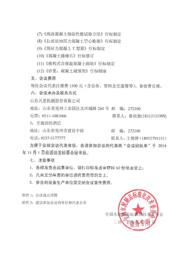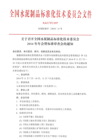 11月7日-9日全國水泥制品標(biāo)準(zhǔn)化技術(shù)委員會2014年年會暨標(biāo)準(zhǔn)審查會在山東天意機(jī)械股份有限公司隆重召開。屆時,委員會相關(guān)領(lǐng)導(dǎo)及行業(yè)相關(guān)科研人員將蒞臨會議,共同商討制訂行業(yè)有關(guān)標(biāo)準(zhǔn)。誠邀各界人士屆時蒞臨天意機(jī)械、經(jīng)典集團(tuán)、卓越精工參觀指導(dǎo)。