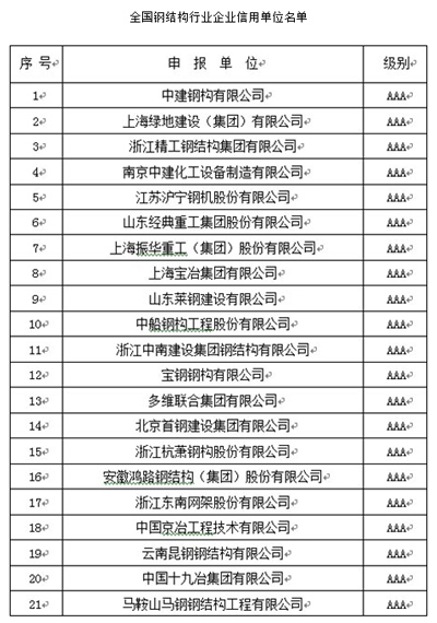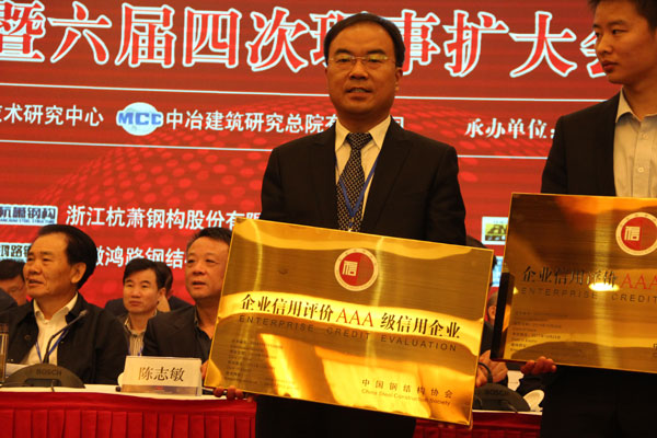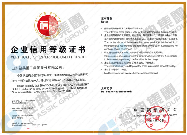 2014年10月26-27日,在南京國際會(huì)議中心隆重舉辦的中國鋼結(jié)構(gòu)協(xié)會(huì)成立三十周年紀(jì)念大會(huì)暨六屆四次理事會(huì)擴(kuò)大會(huì)議上,山東經(jīng)典重工集團(tuán)股份有限公司獲得首批全國鋼結(jié)構(gòu)行業(yè)AAA級(jí)信用企業(yè)。