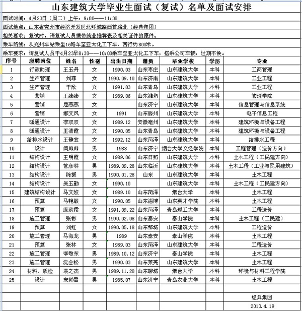 山東建筑大學畢業(yè)生面試(復試)名單及面試安排.xls
