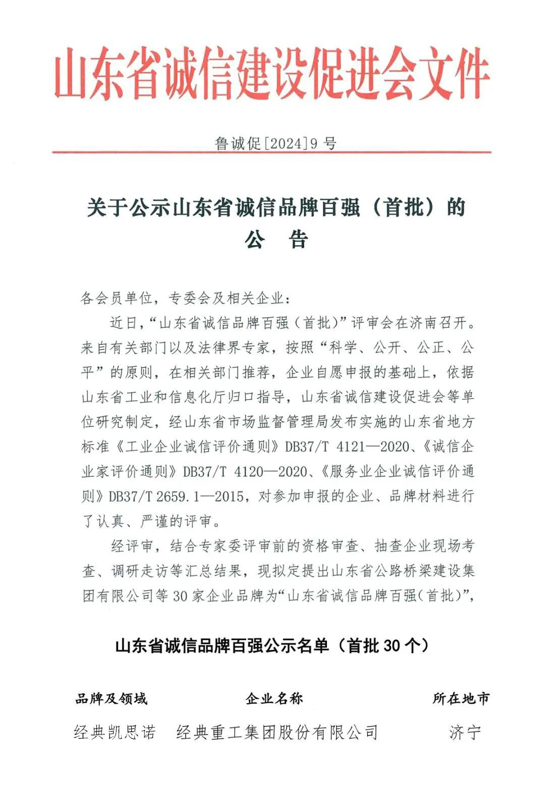 近日,山東省誠信建設(shè)促進(jìn)會(huì)發(fā)布了《關(guān)于公示山東省誠信品牌百強(qiáng)(首批)的公告》,其中經(jīng)典重工集團(tuán)股份有限公司“經(jīng)典凱思諾”品牌成功入選。