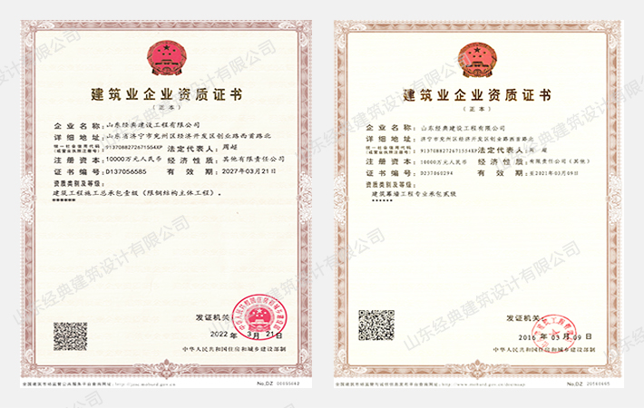 山東經(jīng)典建設(shè)工程有限公司始建于2001年,經(jīng)典集團(tuán)全資子公司。位于古九州之一的兗州境內(nèi),在傳承中華民族傳統(tǒng)建筑工藝的基礎(chǔ)上經(jīng)過不斷的創(chuàng)新發(fā)展,公司現(xiàn)已具備承建現(xiàn)代城市綜合建設(shè)、公用設(shè)施、大型鋼結(jié)構(gòu)工業(yè)廠房、鋼框架結(jié)構(gòu)辦公、商務(wù)、住宅等多種工程的承建能力。